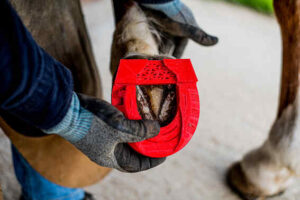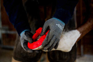 1. Déferrer avec la tricoise à talon sans trop serrer cette dernière pour ne pas couper le fer. Prendre clou par clou en faisant appui sur la paroi sur la longueur du pied jusqu’à ce que le fer soit sorti de chaque côté,